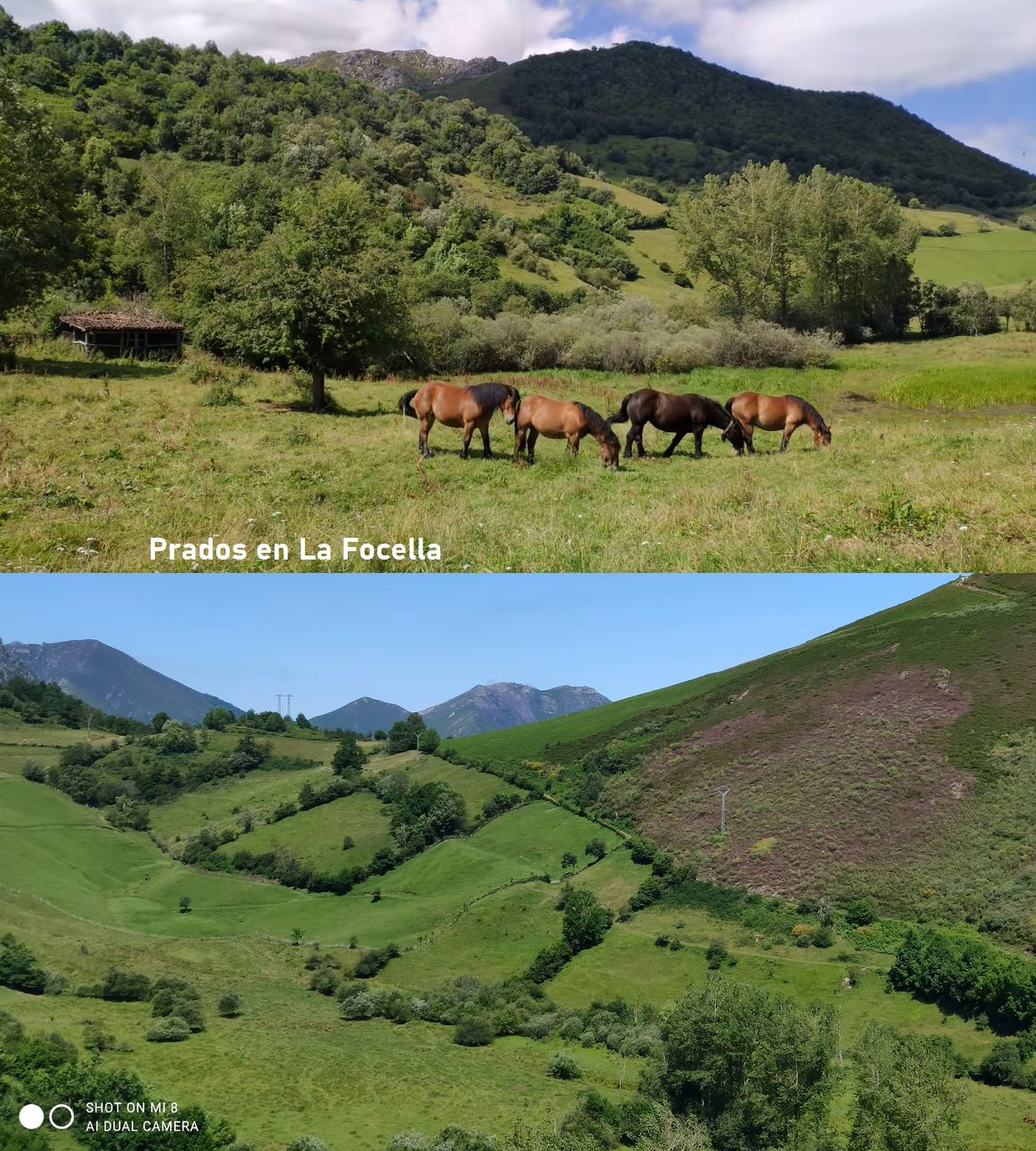 Decir, que la zona de la braña se ve ya, con el zoom, desde la carretera de ascenso a La Focella (primera de las fotos) : justo debajo de la grisácea peña de Cuevas, rodeada de bosques. Se trata de ir ascendiendo por el estrecho vallecito del río Cuevas, que nace precisamente a pocos metros de la braña.